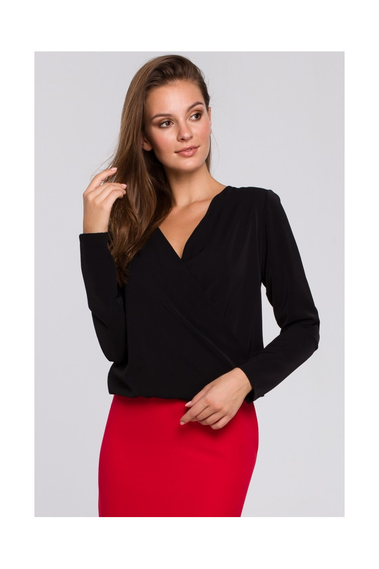 It is a stylish and chic blouse, made of fancy, lightweight fabric. It features sexy wrap front and elasticized bottom hem.