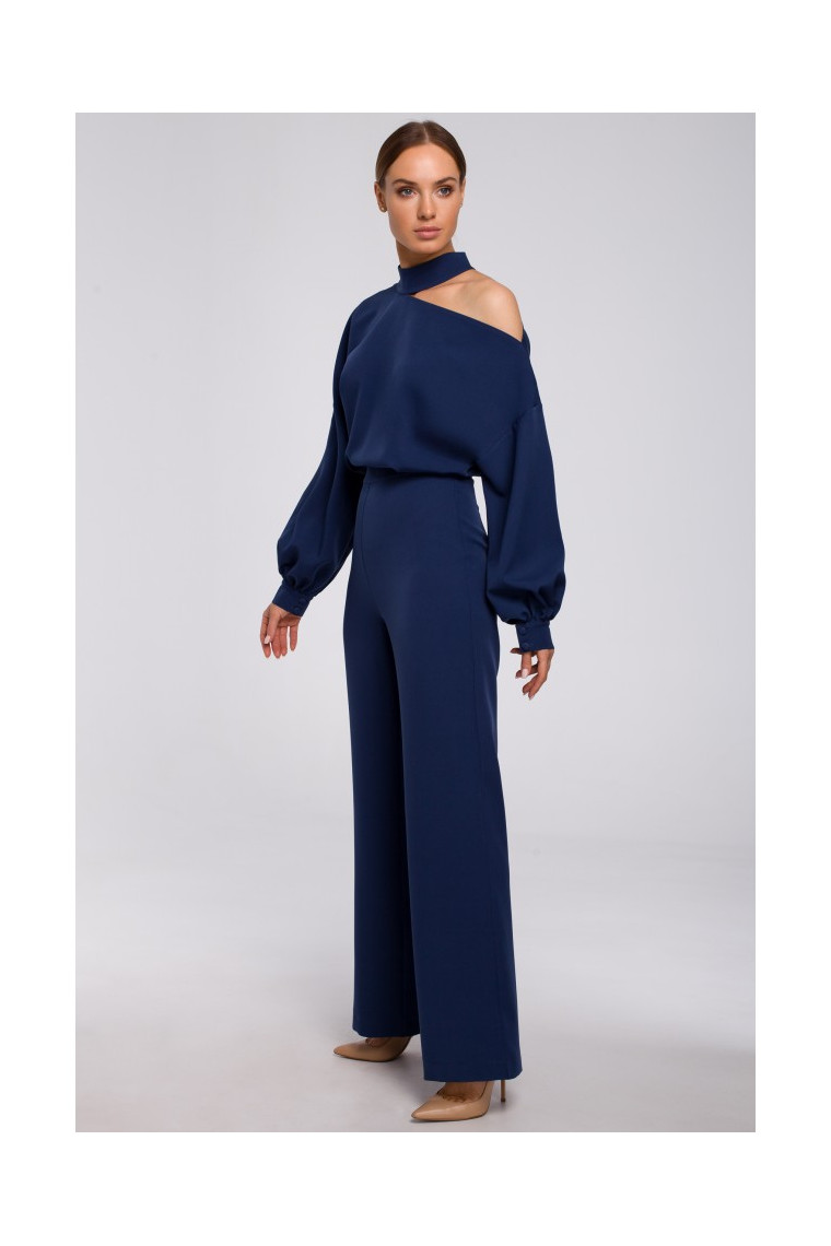 This unique jumpsuit is an elegant alternative to a fancy dress. With its delightful long bishop sleeves finished with cuffs and an extravagant neckline with a side slit on the shoulder you are sure to shine.