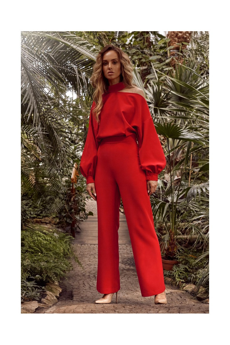 This unique jumpsuit is an elegant alternative to a fancy dress. With its delightful long bishop sleeves finished with cuffs and an extravagant neckline with a side slit on the shoulder you are sure to shine.