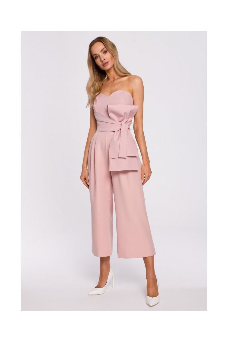 Break the stereotypes and show off your individuality. With an occasion jumpsuit like this you will rock the party! Effective strapless bodice with a bow and a tie belt that cinches your waist flatter your silhouette, wide mid-calf length legs accentuate the original character of the outfit.