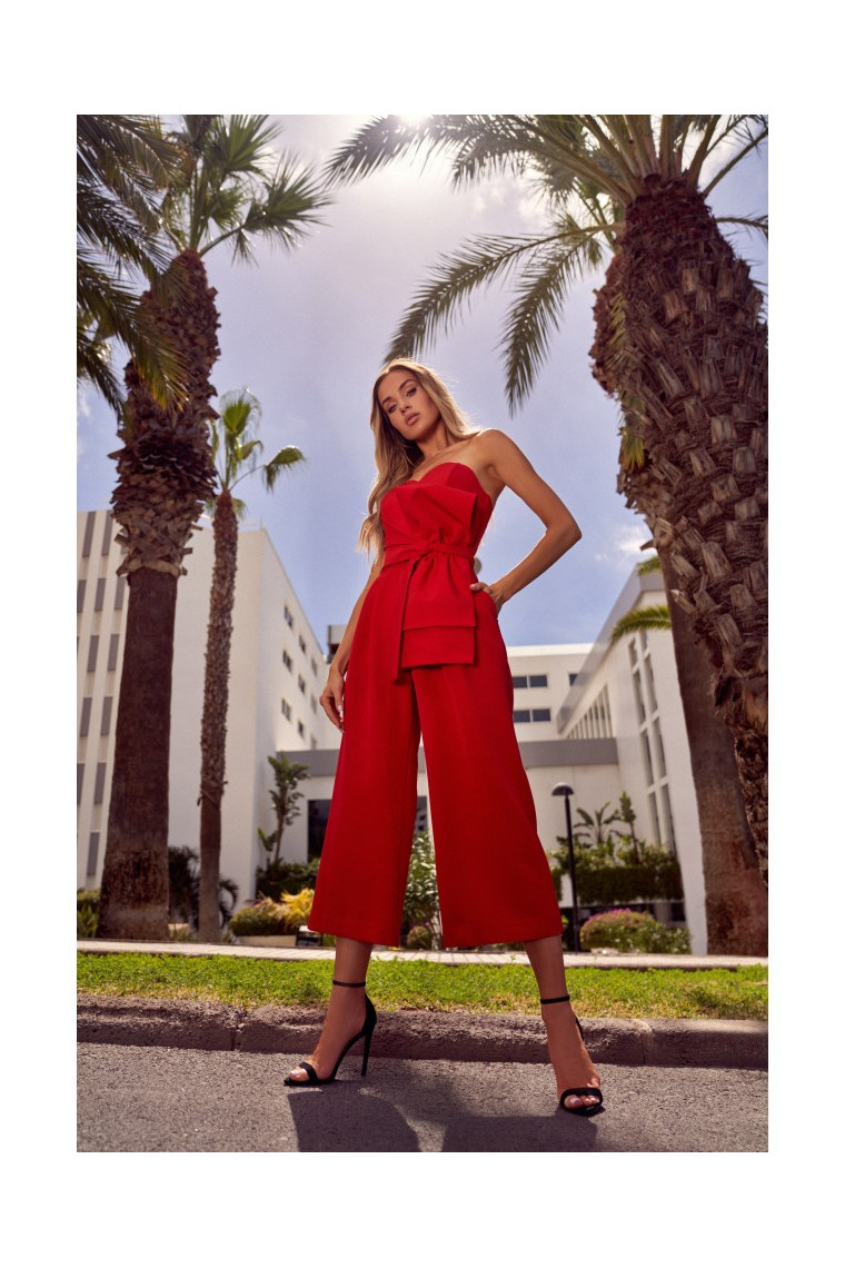 Break the stereotypes and show off your individuality. With an occasion jumpsuit like this you will rock the party! Effective strapless bodice with a bow and a tie belt that cinches your waist flatter your silhouette, wide mid-calf length legs accentuate the original character of the outfit.