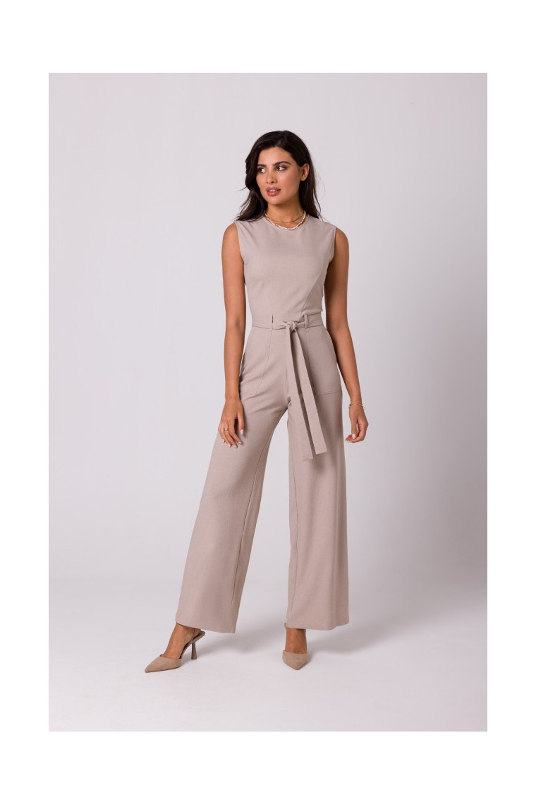 Šis kombinezons bez piedurknēm ar sasiešanas jostu un kabatām var būt universāls un moderns vasaras apģērba gabals.