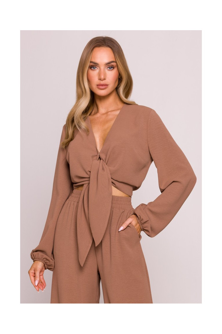 Shape: straight cut with asymmetrical front and tie option, slightly puffed sleeves