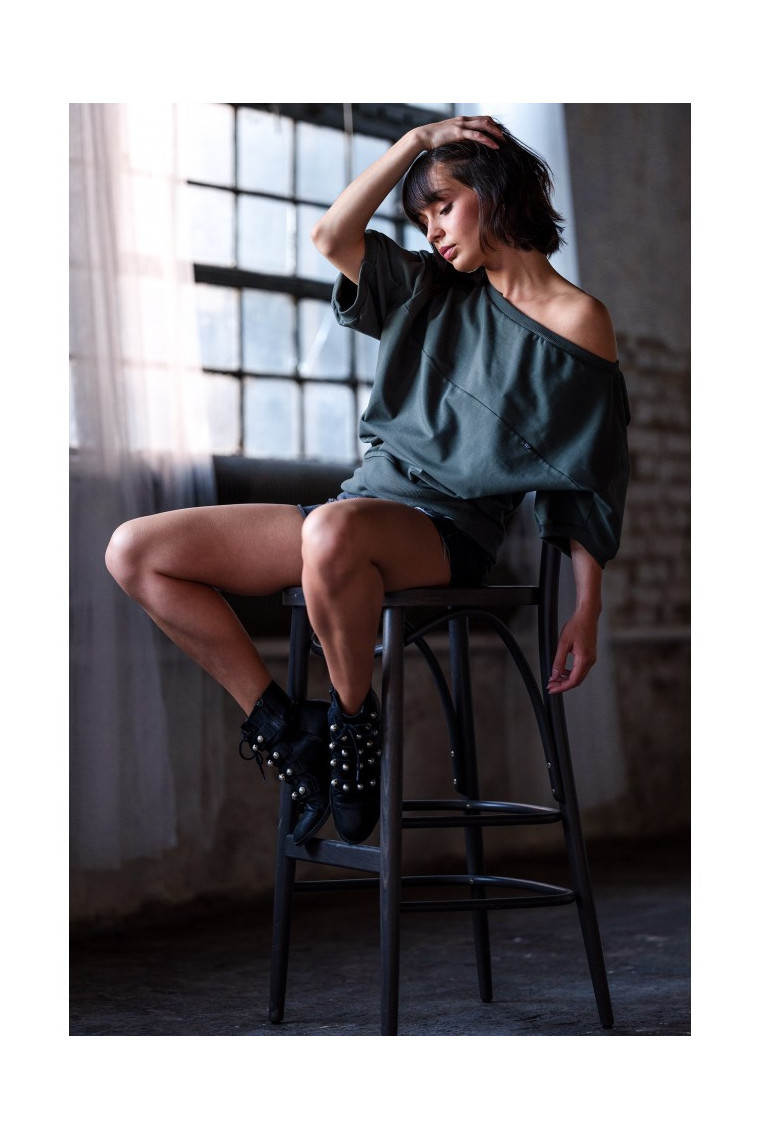 asymmetrical wide "off-shoulder" neckline (can be worn off one shoulder)