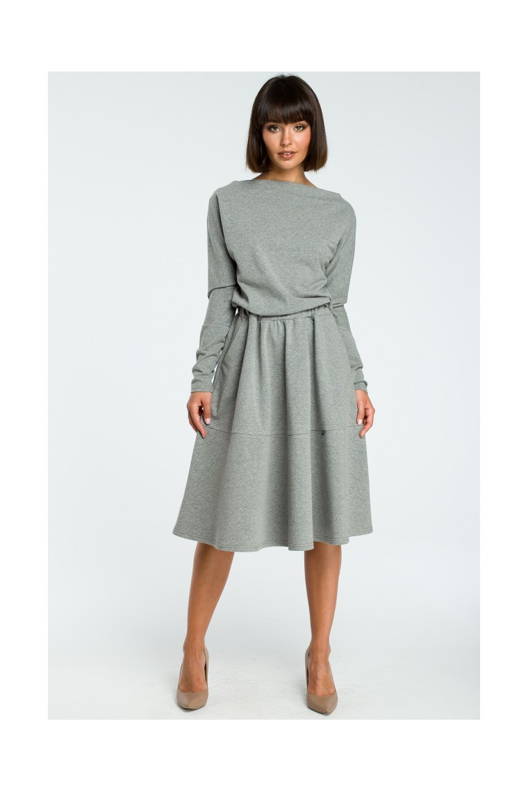 Fit and flare cut with drapey neckline and elasticized waist. This soft-cotton mid-length dress with side pockets will be loved.