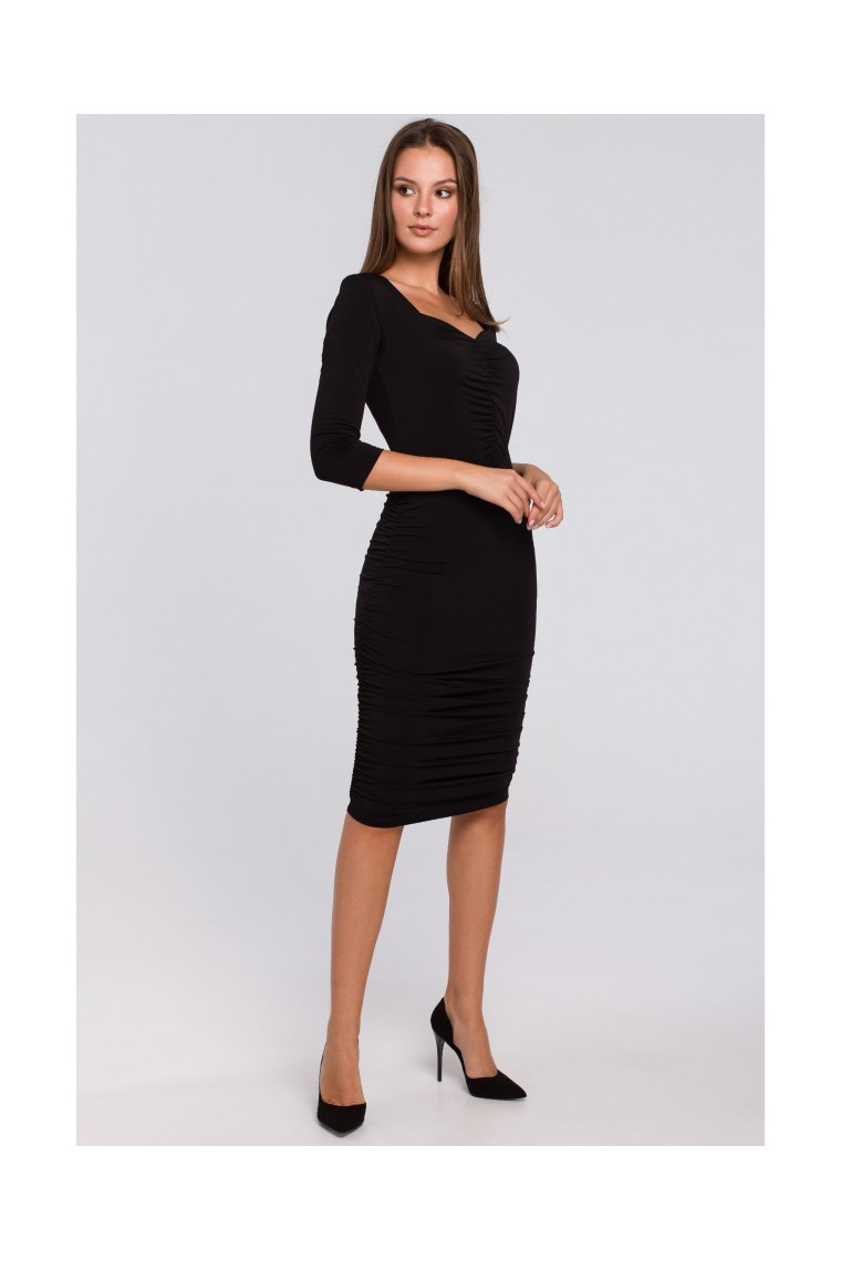 Gorgeous in every way. With its curve hugging cut featuring ruched detailing, midi length and princess neckline, this dress composed of a stretchy knit fabric with pretty is chic and stunning.