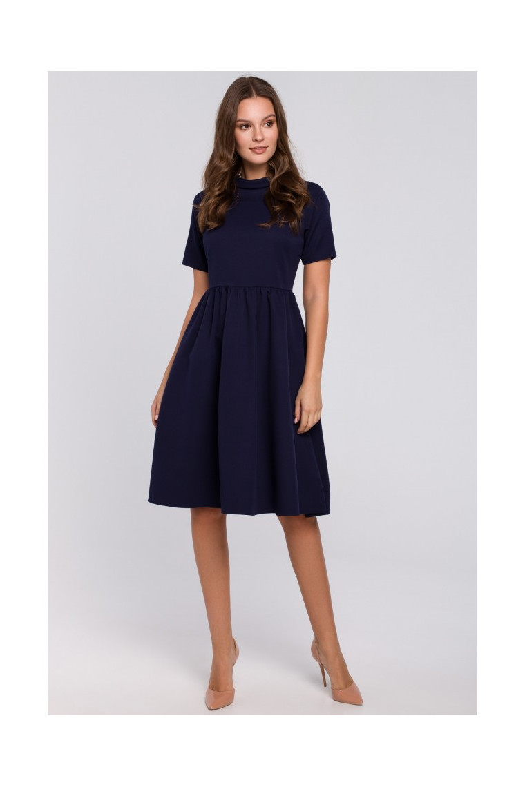 Fit and flare dress with raglan sleeves and an interesting rolled-up, stand-up collar. Cinched waist and flared skirt make it a very feminine piece.