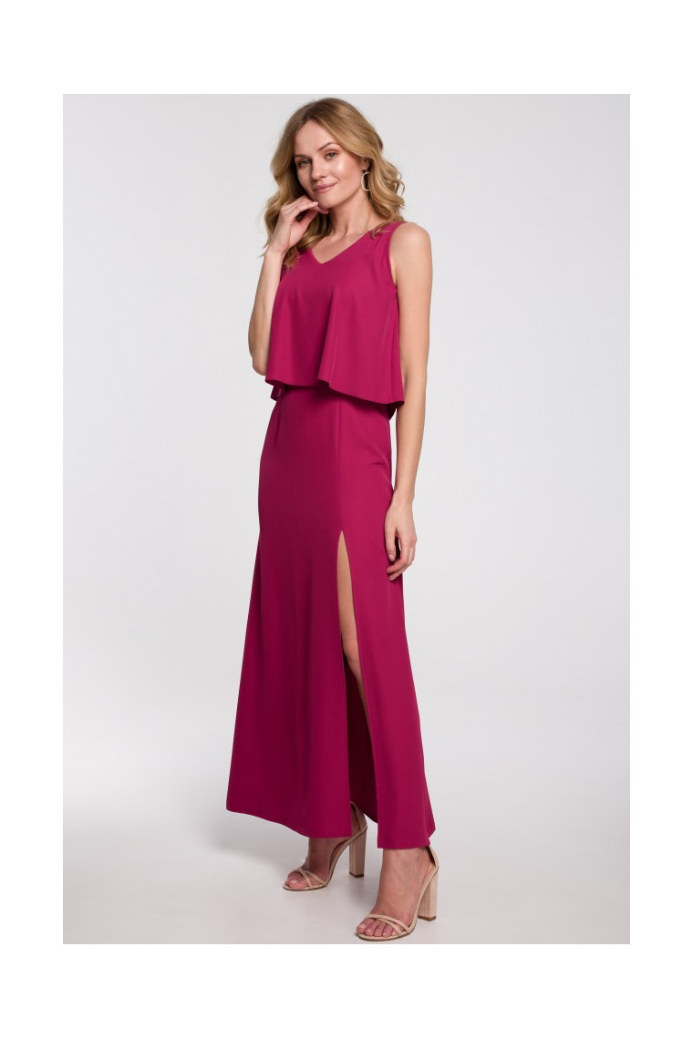 This glamorous dress features a double layered, sleeveless frill top with a v-neckline. Flowy top leads to a curve hugging floor length silhouette which boasts a high side slit. It is a chic and classy occasion gown.