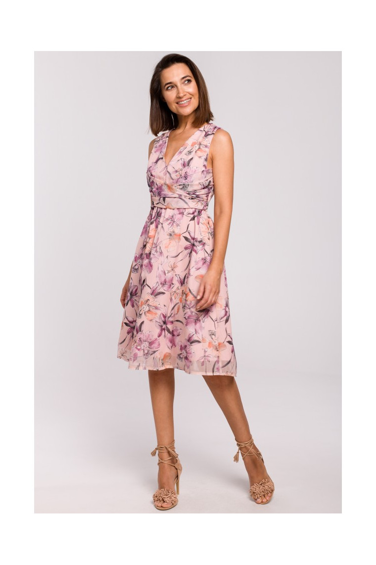 This elegant dress is made from lightweight striped chiffon with floral print and features a plunging V-neck and decorative gathered waist belt.