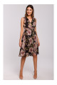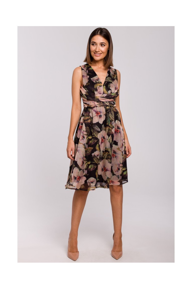 This elegant dress is made from lightweight striped chiffon with floral print and features a plunging V-neck and decorative gathered waist belt.