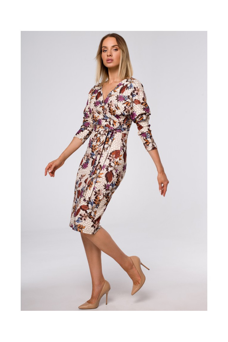 Fitted pencil skirt, relaxed wrap top with long sleeves and a strap to finish off the effect. This multicolor print dress is sensual and comfortable thanks to elastic ebbed knit fabric.