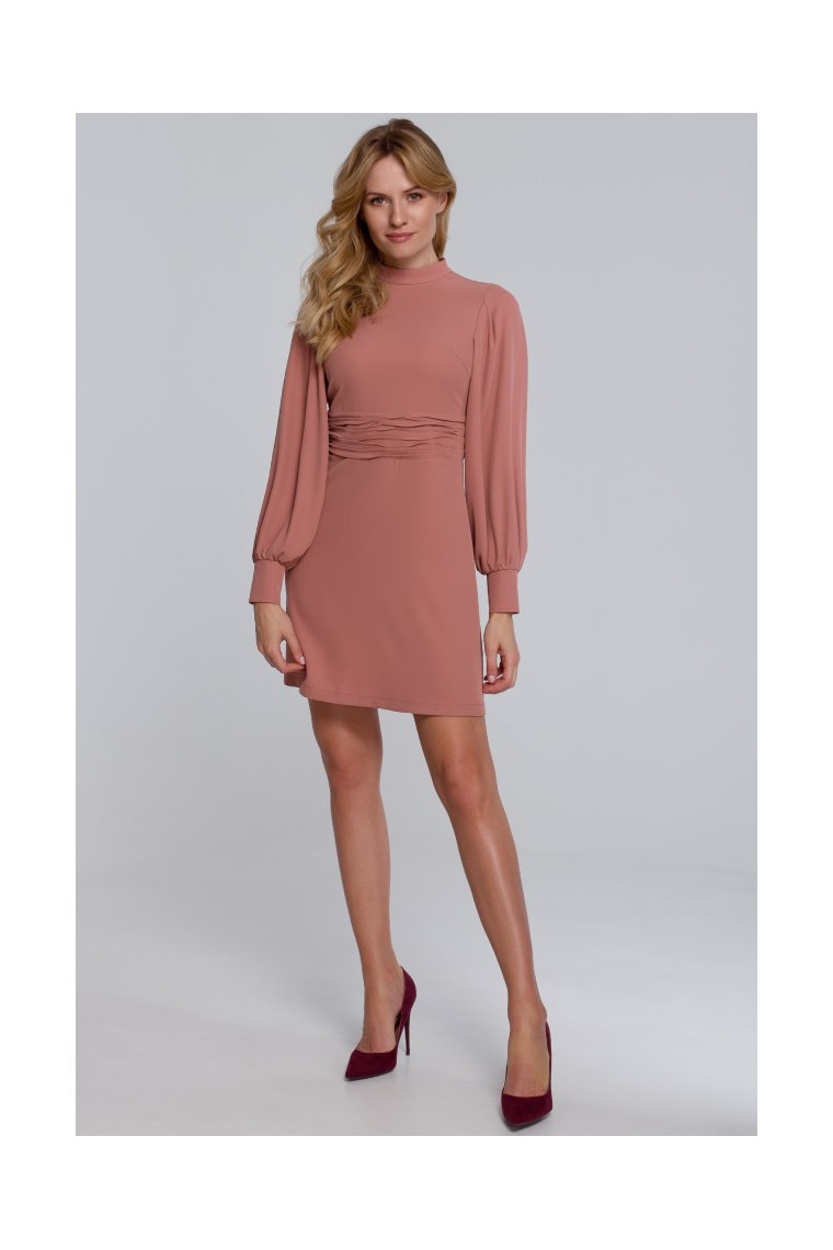 A dress for special occasions. The closed top with a stand-up collar contrasts with the short bottom, creating balance. The thick, gathered belt at the waist draws attention, emphasizing the figure. Puffed sleeves with covered buttons at the cuffs are details that give the whole thing a unique character.