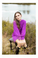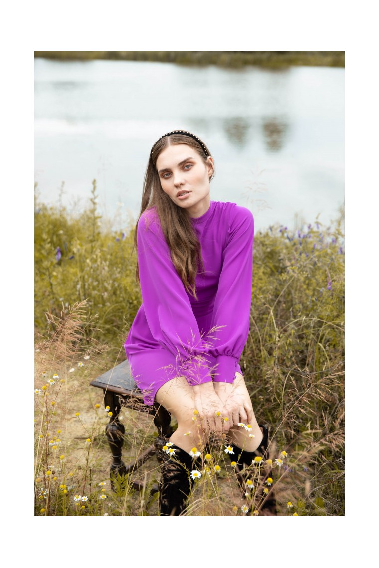 A dress for special occasions. The closed top with a stand-up collar contrasts with the short bottom, creating balance. The thick, gathered belt at the waist draws attention, emphasizing the figure. Puffed sleeves with covered buttons at the cuffs are details that give the whole thing a unique character.