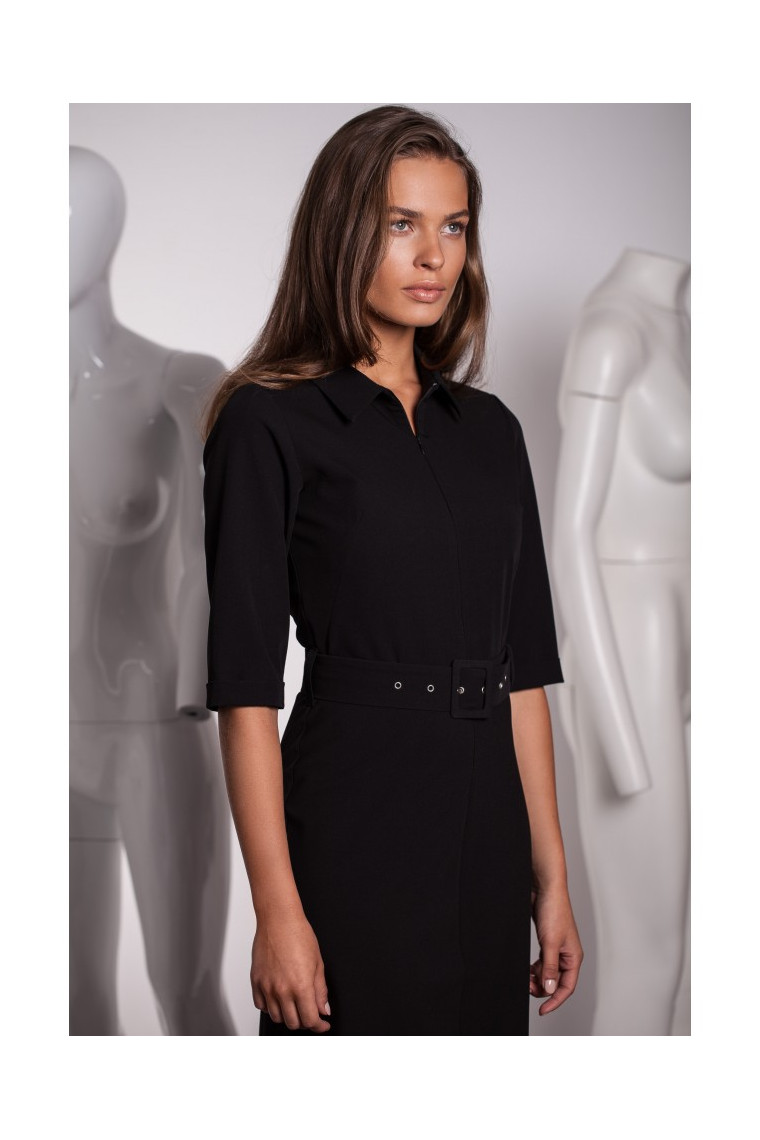 Cinched in the waist with a buckle belt, with bias cut skirt and zipped top with a classic collar - it is a fashionable dress code attire.