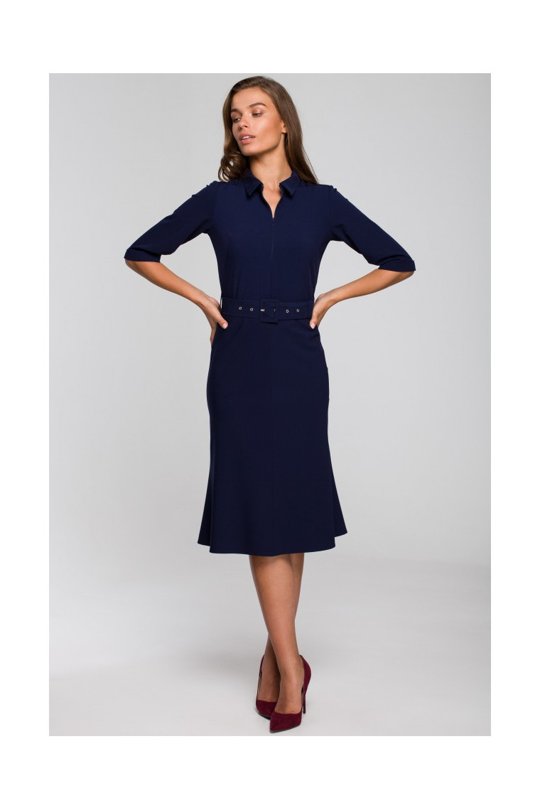 Cinched in the waist with a buckle belt, with bias cut skirt and zipped top with a classic collar - it is a fashionable dress code attire.