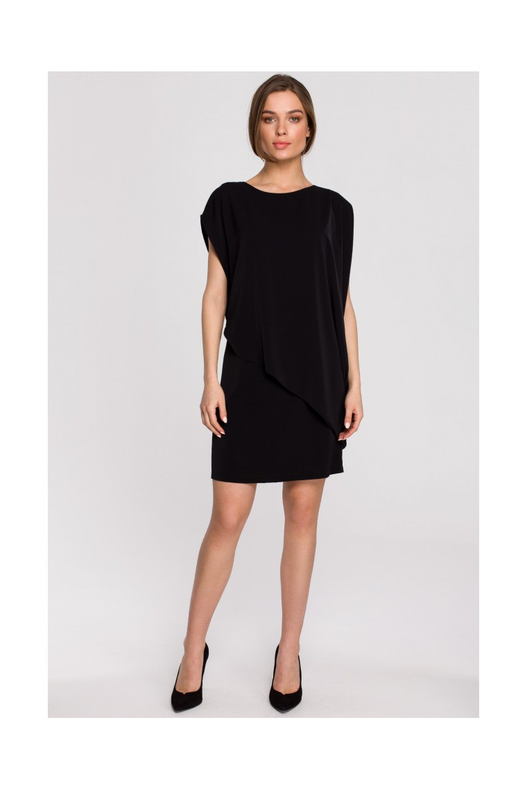 This dress flatters any figure type. Featuring a straight cut and above knee length it is defined with an asymmetric outer layer that hides any imperfections.