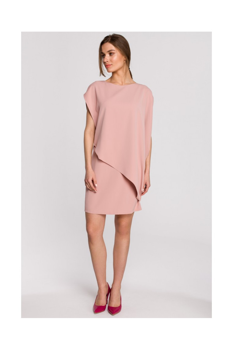 This dress flatters any figure type. Featuring a straight cut and above knee length it is defined with an asymmetric outer layer that hides any imperfections.