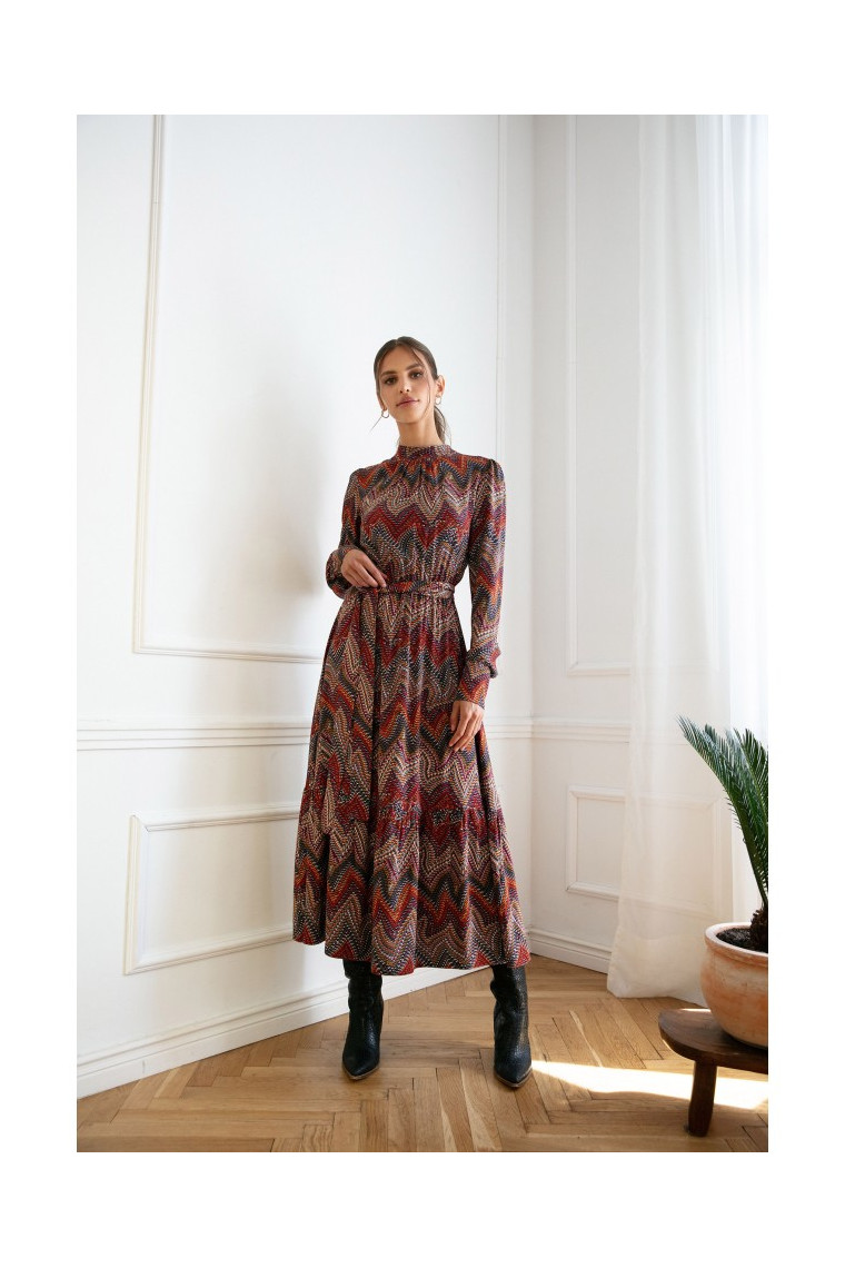 Maximum comfort, maximum elegance in a form of a maxi dress in aztec print with a ruffled bottom hem and a stand-up collar. Best complemented with high boots.