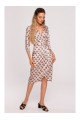 Tas ir glīts, sievišķīgs un ļoti unikāls. Šī kleita ir apmetināta priekšpusē, un tā ir pabeigta ar kaklasaites detaļu, un tās piegriezums ir no jauka satīna auduma ar ģeometrisku apdruku, kas ir daudzās košās krāsās.