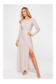 Īpašam notikumam gatava vakarkleita. Viegls audums ar mirdzošu apdari, garš un glīts piegriezums ar augstu kāju šķēlumu un tievām garām piedurknēm.