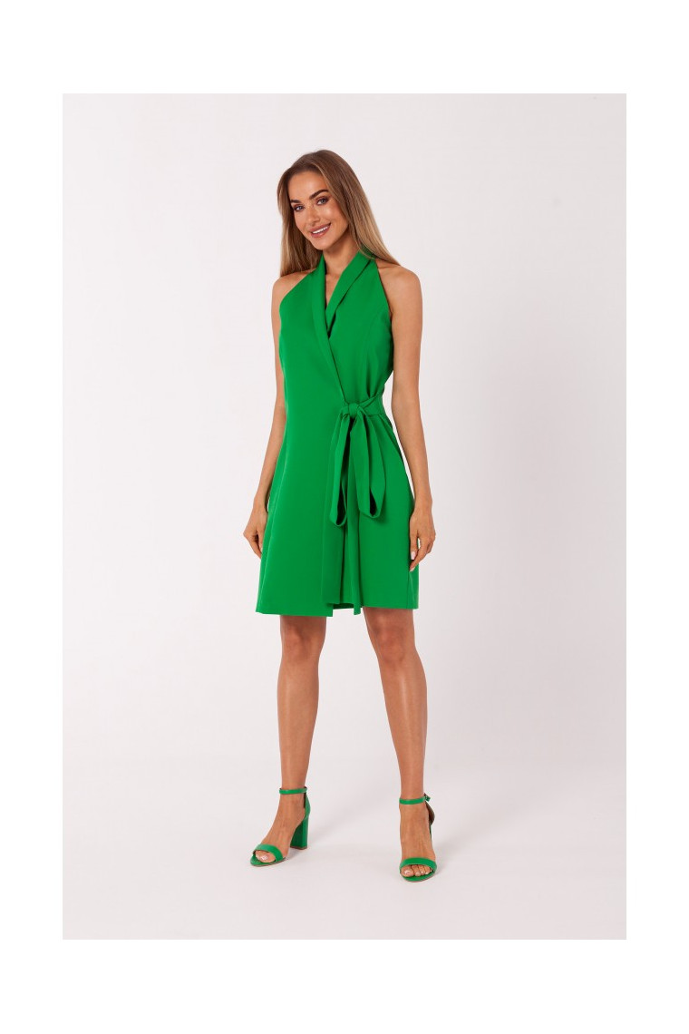 Apmetuma kleita ar kakla izgriezumu, kas papildināta ar šalles apkakli. Aizsieniet to ap vidukli vai sānos.