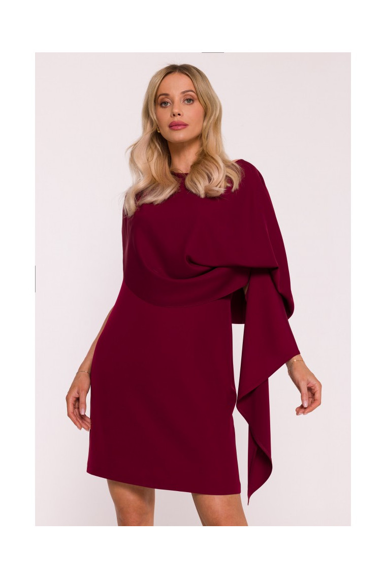 Shape: straight silhouette, top with decorative cape and asymmetrical drape