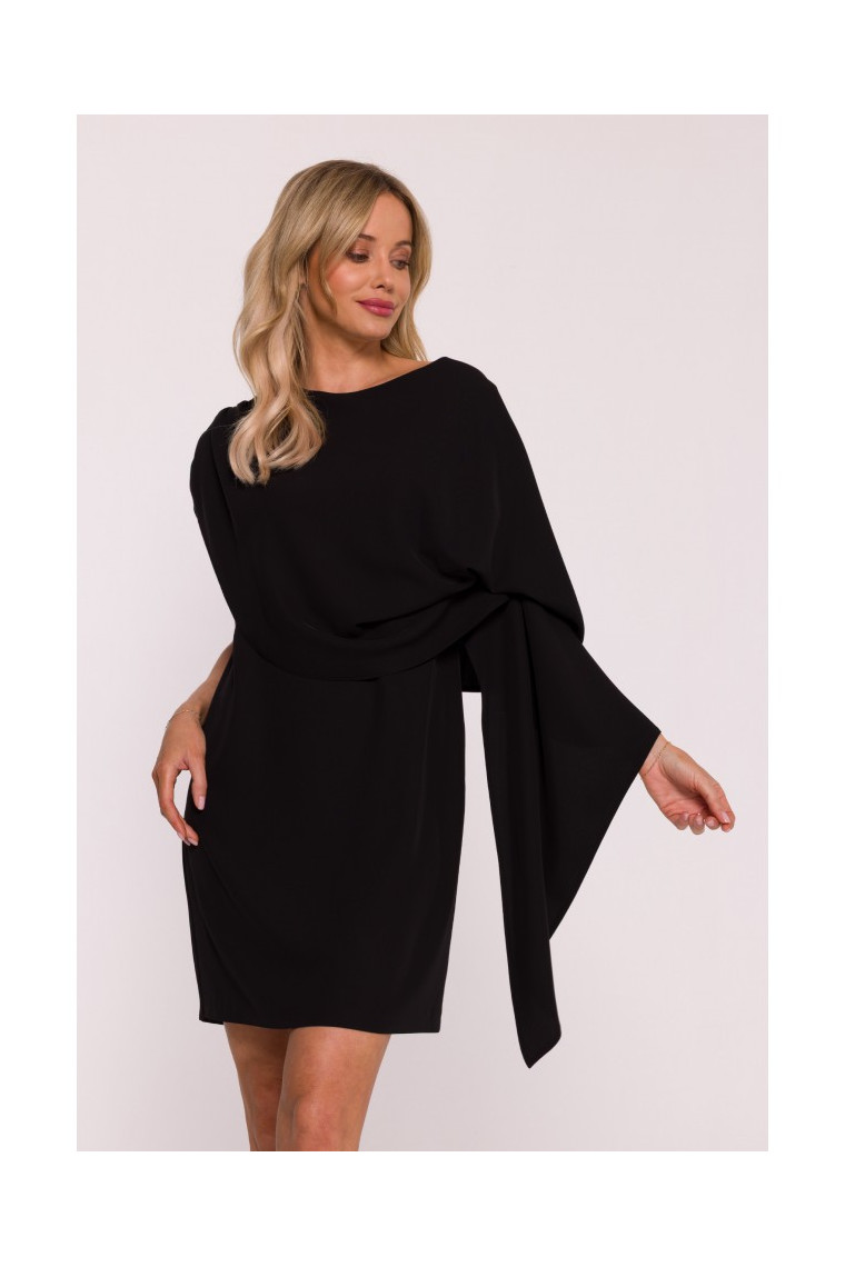 Shape: straight silhouette, top with decorative cape and asymmetrical drape