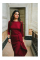 Skirt: straight, with a decorative ruffle running along the side line of the skirt, high slit at the back