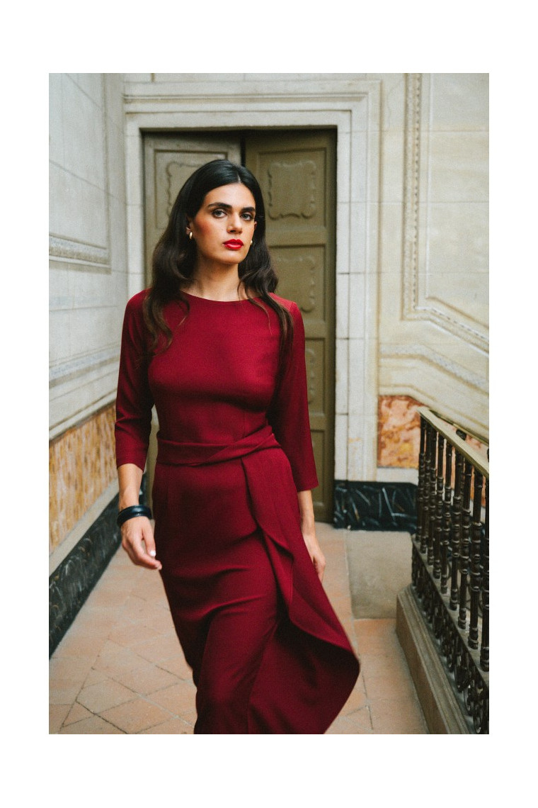 Shape: slightly fitted silhouette, straight skirt accented with decorative elements