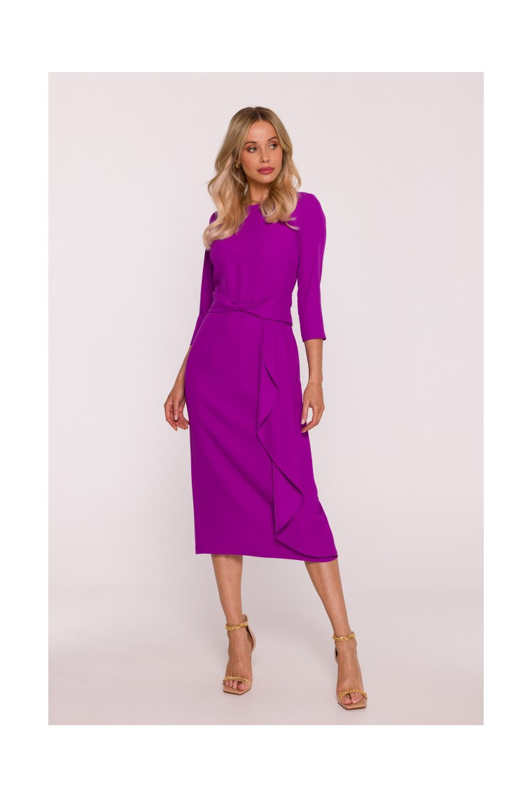 Skirt: straight, with a decorative ruffle running along the side line of the skirt, high slit at the back