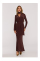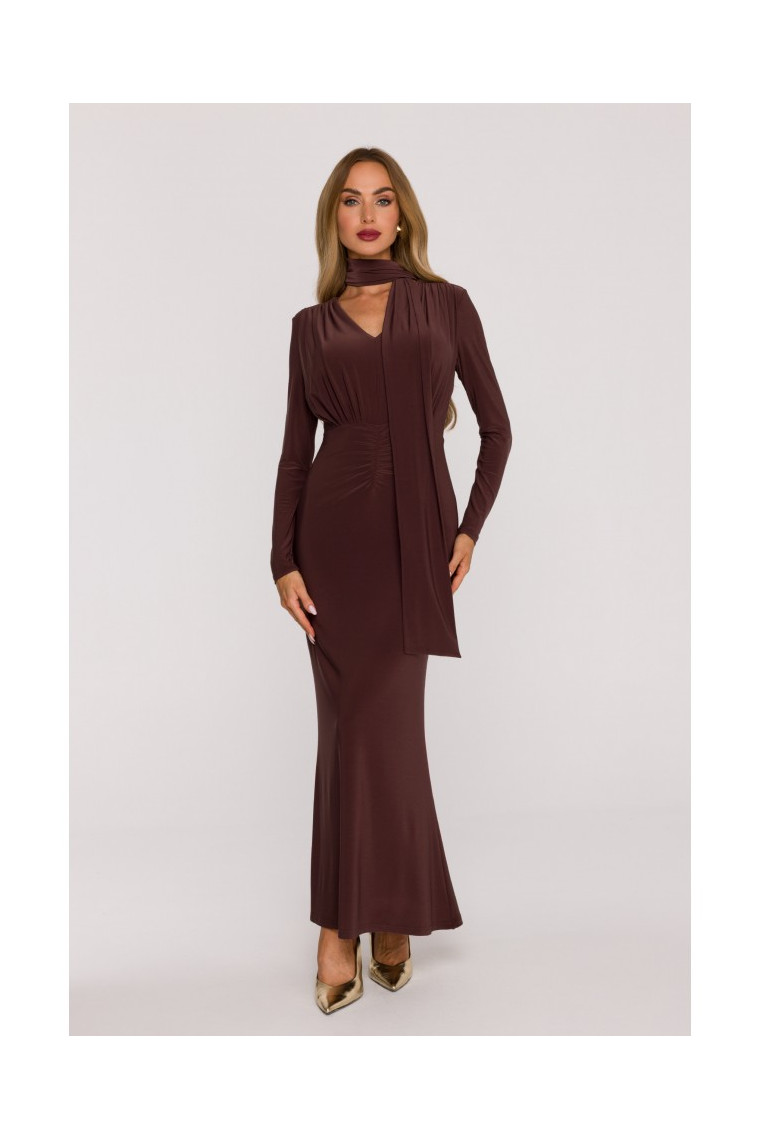 Style: long, fitted maxi dress with V-neckline and a separate sash