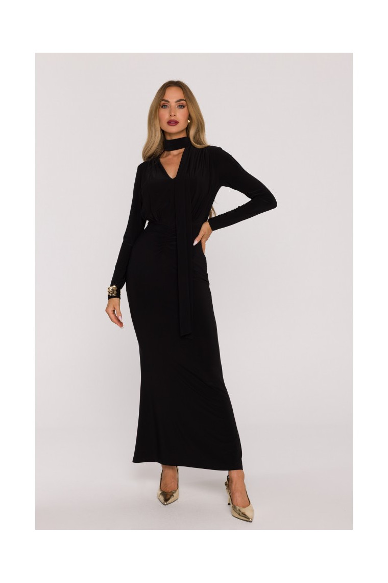 Style: long, fitted maxi dress with V-neckline and a separate sash