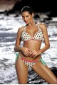 Krūšturis z dekoltem typu halter neck a'la Marylin Monroe, usztywniany i z bocznymi fiszbinami, świetnie zbiera piersi, modeluje je i pięknie prezentuje dekolt. Stylistyka urocza, kobieca, delikatna, acz z charakterem. Ramiączka wiązane na szyi, obwĂłd zapinany na plecach na klamerkę. Izmērs idealnie dopasowane do biustonosza, wiązane po bokach na kokardki, w soczystym kolorze. Wspaniale zdobią biodra, dają sporą wygodę, bowiem mają fajny, biodrĂłwkowy fason. Idealny strĂłj dla kobiety, ktĂłra chce po prostu świetnie wyglądać na plaży.