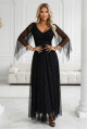 655-1 Garš, mirdzošs tērps ar dekoltē un caurspīdīgām piedurknēm - melns