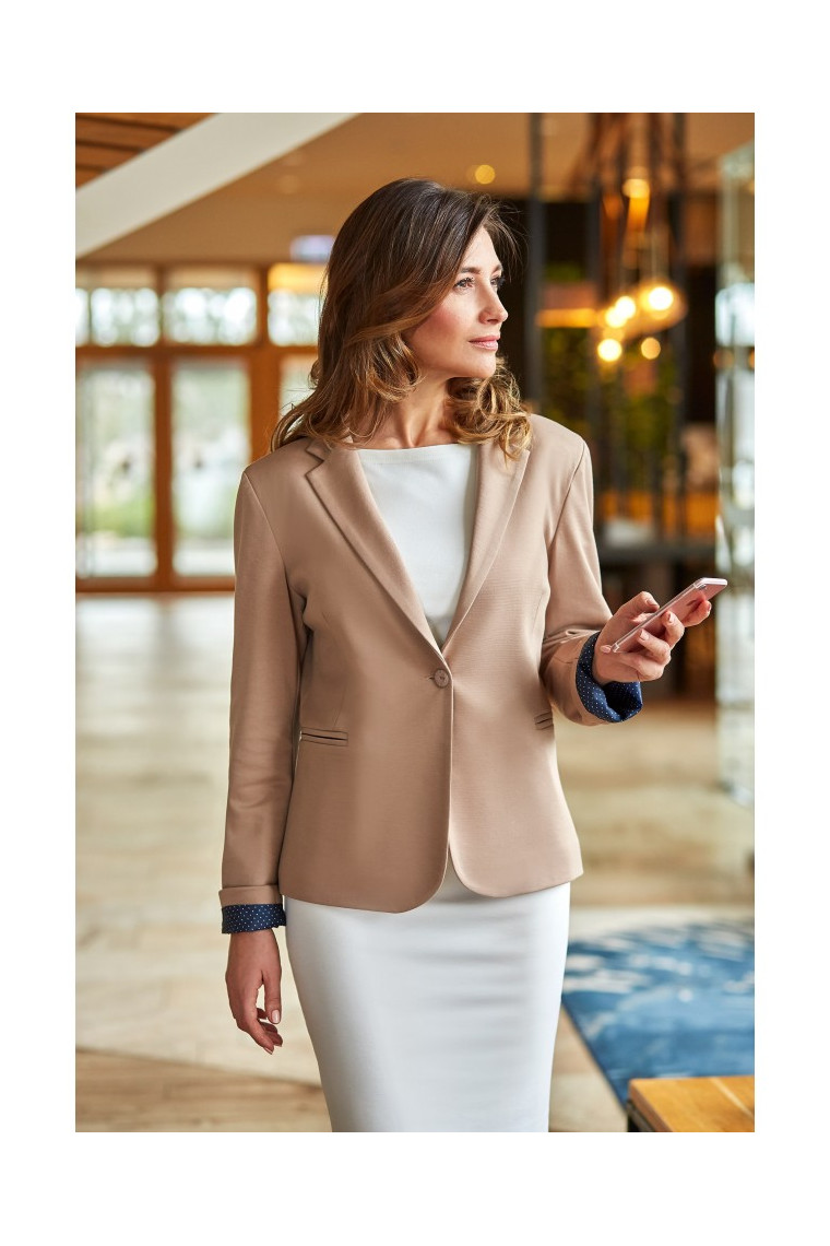 Feminine and fitted but still very cosy - a knit blazer with adorable dotted lining. It’s a versatile piece you can match with jeans and a t-shirt and a classic shirt, too.