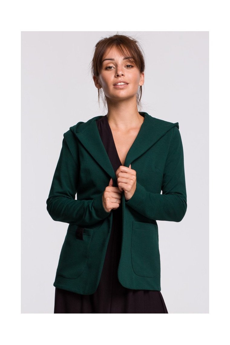 Cut in a straight form of a hooded hip-length blazer, from cotton based knit fabric, this unlined blazer with front patch pockets is an easy match with whatever you choose to wear.
