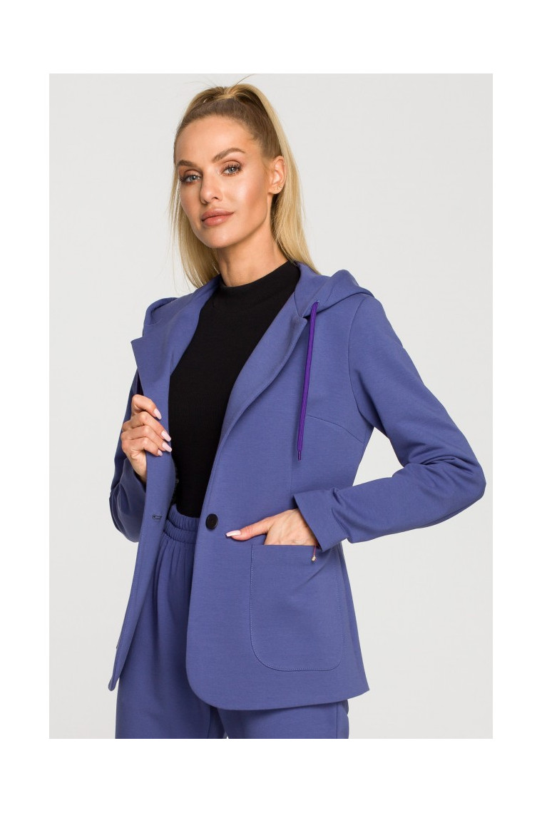 If you think you knew everything about blazers, here is something extraordinary. Cut in a form of a classic single button blazer, this lovely piece was made from knit fabric and features a laid-back string-tied hood and two front patch pockets.