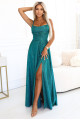 Stunning long evening dress in bottle green is a proposal that captivates with elegance and subtle sparkle. Model with an impressive leg slit, fitted top with thin straps and beautiful lace-up back that emphasizes the back. The dress is perfect for weddings, balls, proms, New Year's Eve or elegant receptions. Made from the highest quality material that moves beautifully in dance and guarantees comfort for all-night wear.